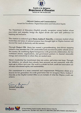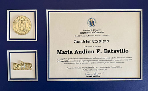 Last November 2025, Maria received an award from the Department of Education for her work in bridging the digital divide for last mile schools. Secretary Sonny Angara commended her for her leadership in transforming data into action, and action into hope.